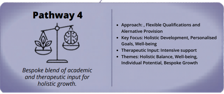 Pathway 4 is a bespoke and flexible pathway building on Pathway 3, combining academic learning with personalised and alternative provision to support individual needs. Students may 'dip' into Pathway 4 during their time on Pathway 3 or may be entirely on Pathway 4. Pathway 4 may include in-reach tutoring, off-site tuition, time at the School Allotment or the use of Alternative Providers such as Therapy Farms.